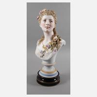 Entwurf Albert-Ernest Carrier-Belleuse (1824 Anizi le Chateau bis 1887 Sèvres), signiert, Ausführung um 1900, ungedeutete Reliefmarke HA & Cie, naturalistische Ausformung in Biskuitporzellan, polychrom bemalt und goldstaffiert, auf profiliertem Rundsockel Schulterstück einer jungen Frau mit seitlich erhobenem Haupt, zahlreichen Rosenblüten im teils hochgesteckten Haar und angedeuteter Spitzenbluse mit Schleifenband, rückseitig in Sockelnähe etwas brandrissig, sonst guter Zustand, beigegeben etwas größerer profilierter Rundsockel mit königsblauem Unterglasurfond und Goldrändern, Sockel ungemarkt und minimalst berieben, D oben 20,5 cm, H Büste 56 cm.