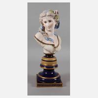 Entwurf Albert-Ernest Carrier-Belleuse (1824 Anizi le Chateau bis 1887 Sèvres), signiert, Ausführung um 1900, ungedeutete Reliefmarke HA & Cie, naturalistische Ausformung in Biskuitporzellan, polychrom bemalt, goldstaffiert und mit Emailletupfen verziert, auf profiliertem Rundsockel Schulterstück einer jungen Frau mit seitlich gesenktem Haupt und aufgeknöpfter Spitzenbluse, das wallende Haar mit einem langen Schleifenband und einer Rosenblüten geschmückt, altersgemäß guter Zustand mit kaum sichtbarem Brandriss am Sockelansatz, beigegeben nicht ganz passender profilierter Rundsockel über quadratischer Plinthe mit kobaltblauem Unterglasurfond und Goldstaffage, blaugepinselte Sèvres-Imitationsmarke mit Beizeichen BB, einige Brandfehler und oberer Abschluss mehrfach gechipt, Maße Sockel 15 x 19 x 19 cm, D oben 11,5 cm, H Büste 37,5 cm.