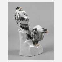 grüne Stempelmarke 1905–1929, geprägte Modellnummer 9238, naturalistische Ausformung und Unterglasurbemalung, auf hohem Felsensockel zwei lauernde Greifvögel sitzend, guter Zustand, H 20,5 cm.