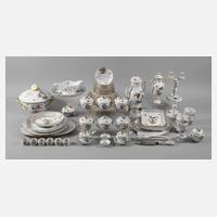 für sechs Personen, 72 Teile, blaue Stempelmarke mit Zusatz Handpainted, 2. Hälfte 20. Jh., diverse Pinselnummern und -buchstaben, reliefierte Form "Ozier/Neuozier" mit Blumen- bzw. Früchteknauf, Dekor in polychromer Aufglasurbemalung über Linienvordruck, Goldstaffage und Goldränder, bestehend aus Kaffeekanne, Sahnegießer, Zuckerdose, je sechs Tassen und Suppentassen sowie zwei Cremetöpfen, alle jeweils mit dazugehörigen Untertassen, je sechs Dessert-, Speise- und Suppentellern, einer Deckelterrine und einer Sauciere, je zwei Anbietplatten und -schalen, zwei Durchbruchschalen, einer Tortenplatte, Stövchen mit Teelichthalter, einer Deckelvase, Bonbonniere, Menage, Messer und Schöpfkelle sowie zwei Kerzenleuchtern und sechs Serviettenringen, vereinzelt minimal kratzspurig, sonst guter Zustand, H Kanne 25,5 cm, H Vase 25 cm, D Tortenplatte 28 cm, D Teller je 19 cm, 24 und 25 cm, L Platte max. 38 cm, L Messer 27 cm.
