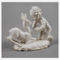 Entwurf Karl Tutter 1936, signiert, grüne Stempelmarke der Kunstabteilung 1937–1968, Malermonogramm Sch., naturalistische Ausformung in Weißporzellan mit dezenter Goldstaffage, auf gewölbtem Rocaillesockel mit Terrainrelief einander gegenüber kniende Putto mit Blumengabe und Rehkitz im Zwiegespräch, guter Zustand, H 10 cm.