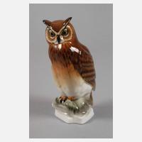 Entwurf Uwe Netzsch um 1970, signiert, grüne Stempelmarke 1970–1985, geritzte Modellnummer 3702, naturalistische Ausformung und Unterglasurbemalung, auf Felsensockel mit Gras sitzende Eule, guter Zustand, H 17 cm.