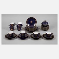 für zehn Personen, Porzellanmanufaktur Bing & Gröndahl, limitierte Auflage, goldene Stempelmarken 1980-1987, Modell- und Dekornummern, glatte Form mit kobaltblauem Fond und Golddekor als Medaillons mit Komponistenportraits in Schattenriss-Manier bzw. Bezeichnung und Lebensdaten, darunter Bach, Beethoven, Brahms, Chopin, Grieg, Haydn, Mozart, Nielsen, Sibelius und Schubert, bestehend aus zehn Gedecken, zwei weiteren Tellern sowie Zuckerdose und Kuchenplatte mit Notenschlüsselmotiv und reliefierten Handhaben als Seepferdchen bzw. Fische, eine Tasse mit durchgehendem Haarriss, sonst guter Zustand, H Tasse gesamt je 7 cm, D Teller je 17 cm, D Tablett max. 27,5 cm.