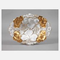 unterglasurblaue Schwertermarke nach 1948, ein Seiten- und Unterstrich, Präge- und Pinselnummern sowie Jahreszeichen für 1996, gemuldete Schale mit üppigem Reliefdekor aus konzentrisch angeordneten und mittig eine Rosette bildenden Rebstöcken, reiche Goldbronze- und Glanzgoldstaffage, sehr guter Zustand, D 21,5 cm.