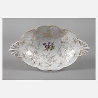 unterglasurblaue Schwertermarke nach 1948, zweimal gestrichen, geprägte Modellnummer K291, Präge- und Pinselnummer sowie Jahreszeichen für 1962, tief gewölbte Schale mit teils durchbrochen gearbeiteten Handhaben, konzentrischem Reliefdekor aus alternierenden Blütenranken und mittigem Dekor "Blume 2" in feiner polychromer Aufglasurbemalung, Relief goldgespitzt und Goldränder, minimale Gebrauchsspuren, sonst guter Zustand, L 32,5 cm.