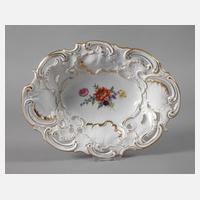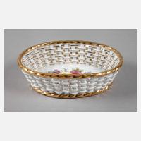 unterglasurblaue Knaufschwertermarke 1860–1924, 1. Wahl, Ritz- und Prägenummern, ovaler Korpus mit durchbrochen gearbeiteter und goldstaffierter Wandung in Korbflechtoptik, feiner polychromer Aufglasurbemalung im Spiegel sowie Goldstaffage und Goldrand, Vergoldung minimalst berieben, sonst guter Zustand, L 13 cm.