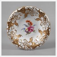 unterglasurblaue Schwertermarke nach 1948, zweimal gestrichen, Präge- und Pinselnummern sowie Jahreszeichen für 1954, tief gemuldete Form mit Reliefdekor aus alternierenden Akanthusblättern auf der Fahne und rosettenförmigen im Spiegel, Zwischenfelder mit Dekor "Gestreute Blümchen" in feiner polychromer Aufglasurbemalung, Goldbronze- und Glanzgoldstaffage, Vergoldung minimal berieben, sonst guter Zustand, D 28,5 cm.