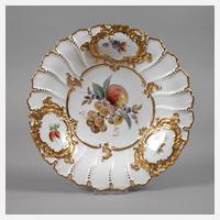 unterglasurblaue Schwertermarke Knaufzeit 1860-1924, 1. Wahl, diverse Präge- und Pinselnummern, gemuldete Form mit muschelförmigem Reliefdekor auf der Fahne, in den drei Rocaillekartuschen und im Spiegel verschiedene Früchte in feiner polychromer Aufglasurbemalung, Goldbronze- und Glanzgoldstaffage, Vergoldung winzigst berieben, sonst sehr guter Zustand, D 29,5 cm.