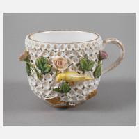 Entwurf Johann Joachim Kaendler 1760, unterglasurblaue Knaufschwertermarke 1860-1924, 1. Wahl, zwei handschriftliche Sammlungsnummern, Becherform mit Asthenkel, gesamte Außenwandung aufwendig verziert mit zahlreichen, einzeln aufbossierten Schneeballblüten, sich windenden Blattranken mit Rosenblüten sowie zwei vollplastischen Kanarienvögeln, polychrom- und goldstaffiert sowie Goldrand, partiell alt restaurierter Zustand, Ranken und Blätter teils bestoßen sowie ein langer Haarriss im Inneren, H 7 cm.