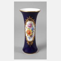 unterglasurblaue Schwertermarke 1970er Jahre, 1. Wahl, Prägenummern und Jahreszeichen für 1973, zylindrischer, konkav gewölbter Korpus mit wulstartig abgesetztem Fuß, königsblauem Fond, schauseitiger Reserve mit üppigem Blumenbukett in feiner polychromer Aufglasurbemalung, Goldkartusche und Goldrand, guter Zustand, H 14 cm.