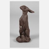Entwurf Paul Walther 1933, monogrammiert, geprägte Schwertermarke nach 1948, 1. Wahl, Schriftzug Böttger Steinzeug, geritzte Modellnummer 86159 sowie geprägte Bossierernummer 131 mit Jahreszeichen für 1990, naturalistische Ausformung in Böttgersteinzeug, auf Kohlblatt Hase in wachsam aufgerichteter Pose, sehr guter Zustand, H 17 cm.