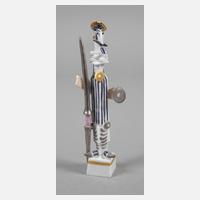 Entwurf Peter Strang 1998, monogrammiert, unterglasurblaue Schwertermarke nach 1948, 1. Wahl, geprägte Modellnummer 81831, Bossierernummer 209 und Jahreszeichen für 2010, Pinselnummer 3214, karikativ stilisierte Ausformung mit polychromer Aufglasurbemalung, Platin- und Goldstaffage, auf quadratischem Podest stehender Mann mit Lanze und Schild, linke Hand fachmännisch restauriert, sonst guter Zustand, H 14,5 cm. Quelle: Bergmann, Meissener Figuren, Supplementband, S. 404, Abb. 2952.
