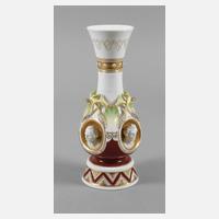 geprägte Rautenschildmarke Mitte 19. Jh., Ritzbuchstabe B und Nummer 3, Balusterform, reich verziert mit umlaufenden Ornamentfriesen und plastischem Floraldekor auf der Schulter, in den vier medaillonartigen Vertiefungen des Bauches jeweils eine plastische Portraitbüste berühmter deutscher Maler und Bildhauer in Biskuitporzellan, bezeichnet als Peter von Cornelius (1783–1867), Wilhelm von Kaulbach (1805–1874), Carl Rottmann (1797–1850) und Ludwig Schwanthaler (1802–1848), alles polychrom bzw. goldstaffiert, seltenes Stück, Büsten teils an der Nase bestoßen bzw. partiell farbfleckig (entfernbar), H 23 cm.