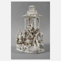 nach einem Alt-Frankenthaler Modell, Entwurf Karl Gottlieb Lück um 1765, geprägte Rautenmarke ab 1905, geritzte Modellnummer 238 sowie Nummer 3, naturalistische Ausformung in Weißporzellan, auf unregelmäßigem Felsensockel detailreiche Pagode mit zwei Chinesen beim etagenübergreifenden Ballspiel sowie üppigem moosartigen Besatz, seltene Figurengruppe, Brüstung unterhalb der linken Figur alt restauriert und Früchteranke auf dem Dach minimalst bestoßen, sonst guter Zustand, H 32 cm.