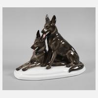 grüne Stempelmarke 1934–1942, geritzte Modellnummer 5567, naturalistische Ausformung und Unterglasurbemalung, auf Ovalsockel sitzender und liegender Hund, guter Zustand, H 29 cm.