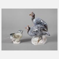 beide Entwurf Waldemar Lindström (1875–1941), signiert, blasse grüne Dreikronenmarke ab 1950, naturalistische Ausformung und Unterglasurbemalung, jeweils auf unregelmäßigem Sockel sitzendes Vogelpaar bzw. kleiner Sperling, guter Zustand, H 16,5 und 6,5 cm.