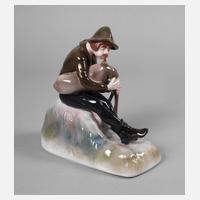 Entwurf Michael Emanuel Beyrer 1913, signiert, grüne Stempelmarke mit Zusatz Kunst-Abteilung Selb-Bavaria und Kriegsmarke 1914–1917, gepinseltes Malermonogramm ME, naturalistische Ausformung und Unterglasurbemalung, auf gestuftem Terrainsockel sitzender Mann beim Dudelsackspielen, sehr guter Zustand, H 17,5 cm.