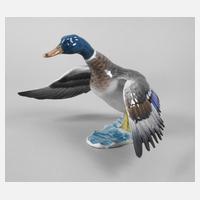 Entwurf Fritz Heidenreich 1937/38, signiert, grüne Rosenmarke 1975-1982, einmal gestrichen, Zusatz handgemalt und Modellnummer 1677, naturalistische Ausformung und Unterglasurbemalung, auf unregelmäßiger Plinthe mit bewegtem Wellenrelief aufsteigende Wildente mit ausgebreiteten Flügeln, sehr guter Zustand, H 20 cm.