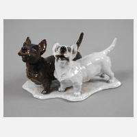 Entwurf Fritz Heidenreich 1938, signiert, grüne Stempelmarke mit Zusatz Germany, Kunstabteilung Selb 1935 (Datierung siehe Quelle), gepinseltes Malermonogramm K, naturalistische Darstellung mit partieller Unterglasurbemalung, auf unregelmäßiger Naturplinthe zwei nebeneinander stehende, aufwärts blickende Scotchterrier in brauner und weißer Fellfarbe, sehr guter Zustand, H 10,5 cm. Quelle: Dieter Struss, Rosenthal-Porzellan, Battenberg 1995, Modellliste S. 146 und Markenverzeichnis S. 135 (Diskrepanz in der Datierung).