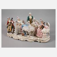 Porzellanmanufaktur Höffner & Co., schwarz gestempelte Neapelmarke 1950–1961, naturalistische Ausformung mit feiner polychromer Aufglasurbemalung und Goldstaffage, auf oblongem Sockel mit frontseitiger Königskrone musizierende Figurengruppe aus sitzendem Cellisten, Harfe-, Cembalo- und Mandolinenspielerin sowie stehendem Sänger im Stil des 18. Jh., der üppige Spitzenbesatz vereinzelt minimal bestoßen, Maße max. 29 x 54 x 24 cm.