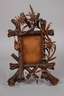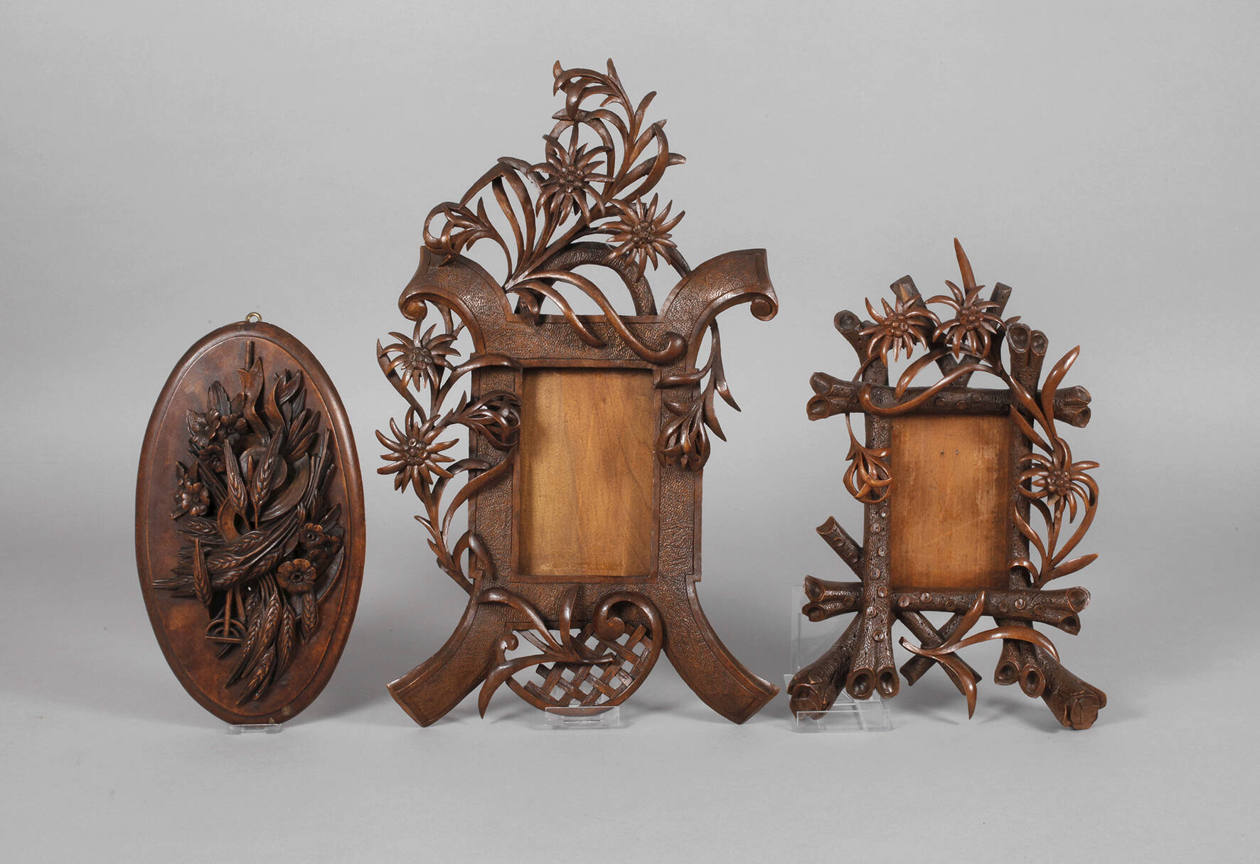 Anfang 20. Jh., Nussbaum massiv, dunkel gebeizt, zwei geschnitzte Rahmen, verziert von Edelweißblüten, dazu plastisches Wandrelief mit Ährenmotiv, dieses rückseitig mehrfach handschriftlich annotiert, gute Erhaltung mit leichten Altersspuren, min. best., L max. 55 cm.