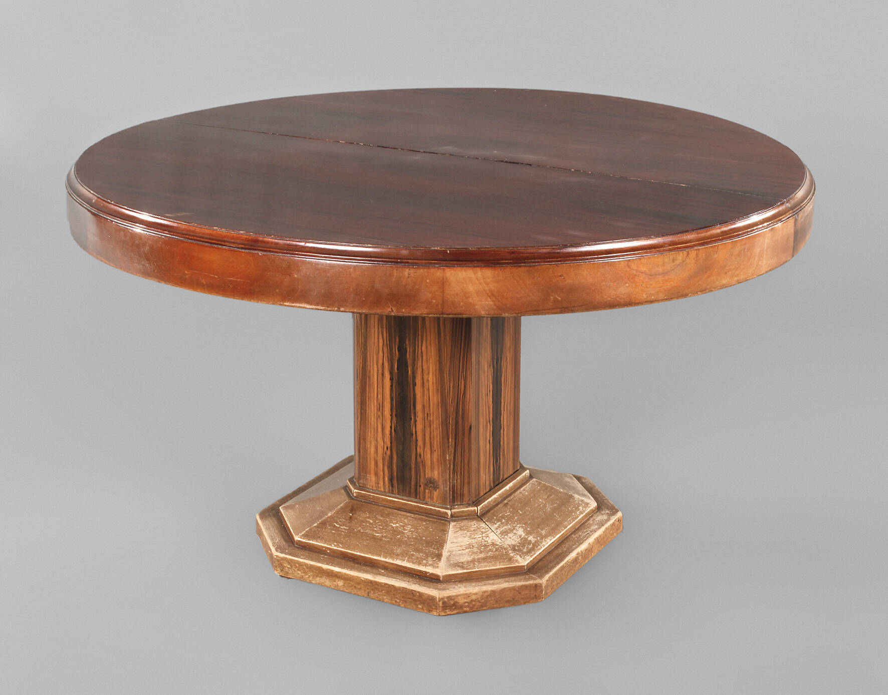 Fuß mit Brandstempel Majorelle Nancy, Frankreich, um 1925, runde Platte in Mahagoni furniert, Zarge und Sockel aus Nussbaum, der achteckige Fuß in Zebranoholz furniert, mehrfach ausziehbar mit automatisch ausklappenden Hilfsbeinen auf Rollen, dazu zwei nachträglich angefertigte Einlegeplatten, Alters- und Gebrauchsspuren, rest.bed., Maße H 75 cm, D 130 cm, L mit zwei Platten 250 cm.
