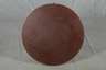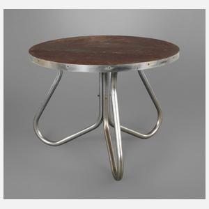 wohl Tschechien, 1930er Jahre, dreibeiniges Gestell in Schlaufenform, aus vernickeltem Stahlrohr, mittels Hutmuttern verschraubt, runde Platte mit bordeauxfarbenem Kunstlederbezug, Alters- und Gebrauchsspuren, Oberfläche teilweise leicht flugrostig, H 64 cm, D 83 cm.