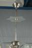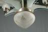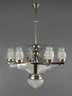 1920er Jahre, ungemarkt, Gestänge aus verchromtem Messing, fächerförmig gegliederter Korpus mit aufgesetzten bzw. abgehängten satinierten Glasschirmen bzw. -scheiben, insgesamt siebenflammig elektrifiziert, gute Erhaltung mit leichten Altersspuren, H 95 cm, D 60 cm.