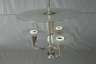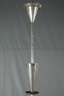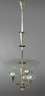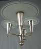um 1925, schlankes verchromtes Metallgehäuse in Kegelform, mit drei c-förmig gebogten kurzen Leuchterarmen, insgesamt vierflammig elektrifiziert, die Schirme als Kreissegmente aus teils satiniertem Klarglas, minimale Altersspuren, H ca. 100 cm, D ca. 40 cm.