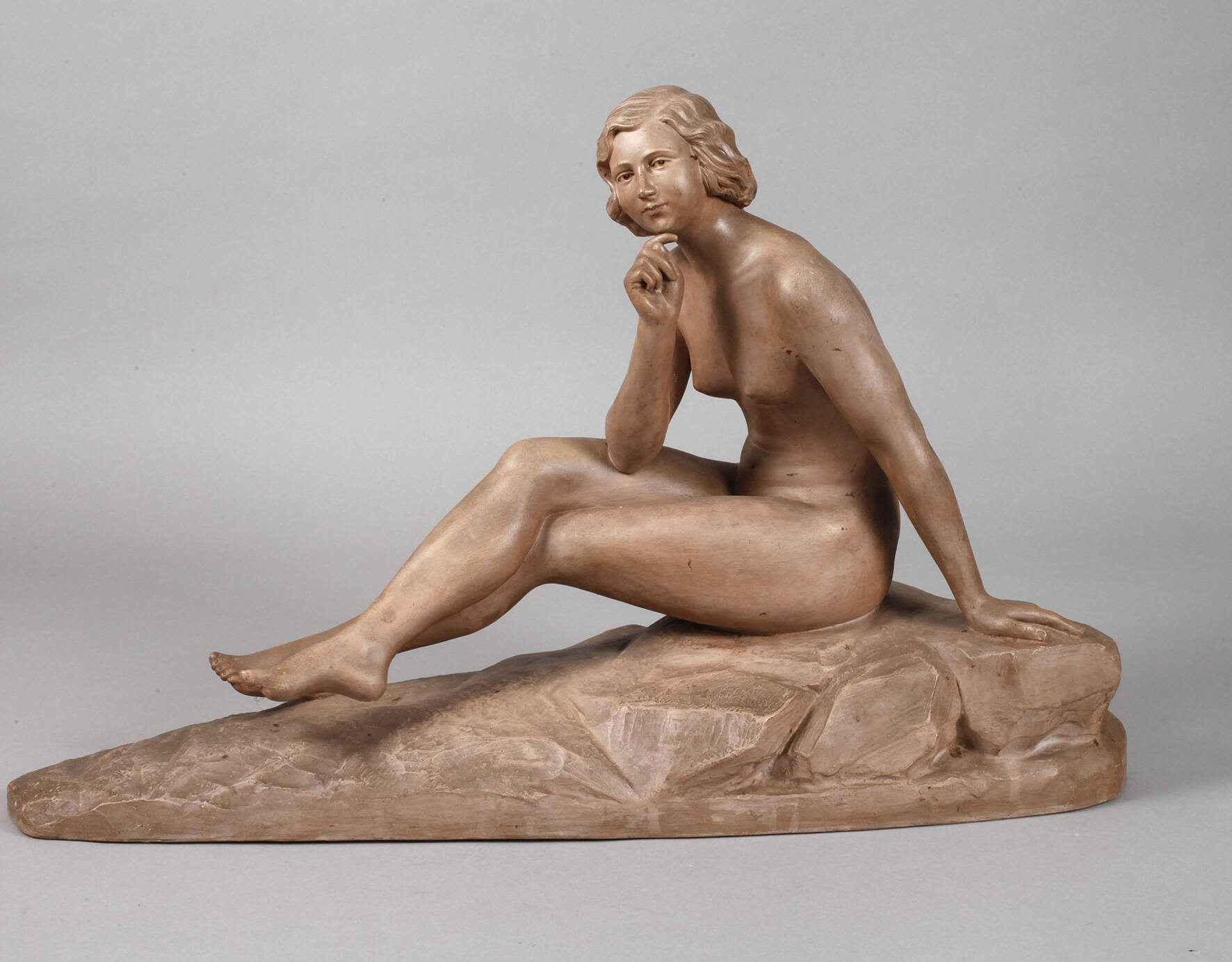 1930er Jahre, am Sockel signiert H. Haniel, junge sinnende Frau mit welligem Haar, auf einem Felsen sitzend, geringe Glasurfehlstellen, sonst guter unbeschädigter Zustand, H 40 cm, L 60 cm.
