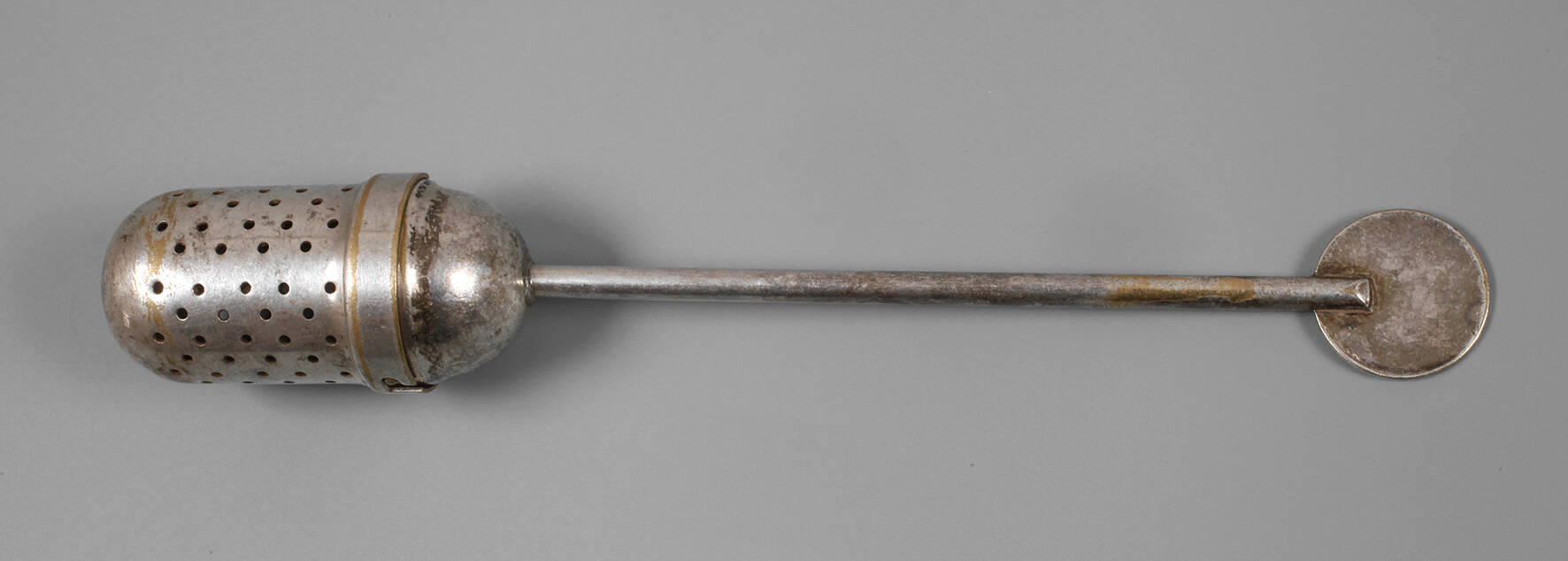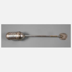 Entwurf 1924, Messing versilbert, Tee-Ei mit zylindrischem durchlöcherten Korpus, gewölbtem eingepassten Schraubdeckel und stabförmigem Schaft, Griff in Form einer kleinen Scheibe, Alters- und Gebrauchsspuren, Versilberung partiell berieben, L ca. 14,4 cm. Quelle: Die Metallwerkstatt am Bauhaus, Ausst.-Kat. Bauhaus Archiv, Berlin 1992, Abb. S. 194, Nr. 142.