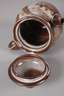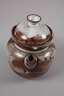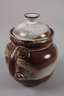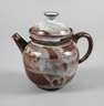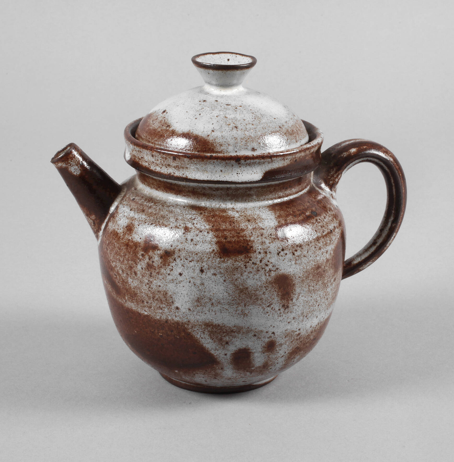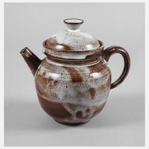 um 1935–40, geprägtes Künstlermonogramm, rotbrauner Scherben mit gesprenkelter grauweißer, großflächig rostrot verfärbter Glasur, über kurzem Standring kugeliger Korpus, der Henkel mit drei Kehlen, kurzer konischer Ausguss, konkaver Mündungsrand, gewölbter Deckel mit gegenläufigem Knauf, der Ausguss mit minimalen Kerben, H mit Deckel 16 cm.