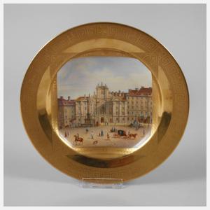 um 1890, ungedeutete unterglasurblaue Herstellermarke Krone mit Schild, gepinselte Schriftzugmarke der Porzellanmalerei Ernst Wahliss sowie Pinselbezeichnung, leicht gemuldeter Teller mit glattem Rand und teils poliertem Goldfond, Mäanderfries der Fahne und Rechteckkartusche mit feiner Reliefgoldmalerei, Spiegelreserve mit Vedute in polychromer Aufglasurbemalung, Ansicht der Kirche am Hof mit Mariensäule und Figurenstaffage, guter altersgemäßer Zustand, D 24,5 cm.