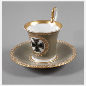 unterglasurblaue Zepter-, rote Reichsapfel- und doppelte Kriegsmarken 1914–1918, gepinselte Dekornummer 125/598, Präge- und Pinselzeichen sowie Jahreszeichen für 1915, Kalathosform mit eingezogenem Standring, ausschwingender Mündung und Schwanenhalshenkel, Aufglasurdekor aus feldgrauem Fond, schauseitiger Ovalreserve mit Eisernem Kreuz 1914 in schwarzer Bemalung, goldenem Lorbeerkranz, Goldrändern und Goldband an der Innenlippe, dazugehörige Untertasse mit korrespondierendem Dekor, sehr guter altersgemäßer Zustand, H gesamt 11,5 cm.