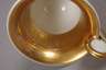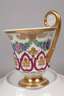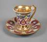Tasse ungemarkt, Untertasse mit unterglasurblauer Zeptermarke 1837–1844, roter Reichsapfelmarke, Pinselbuchstabe I und Ritzzeichen, Glockenform mit gekehltem Fuß und Frauenkopfhenkel, umlaufend verziert mit einer Blumengirlande, rapportierendem Blumen- sowie Volutenmotiv in feiner polychromer Aufglasurbemalung bzw. radierter Goldmalerei, Goldbänder und Teilvergoldung der Innenwand, dazu passende Untertasse mit facettierter Fahne und ähnlichem Dekor aus alternierendem Floralornament und Efeuranke, Vergoldung partiell berieben, sonst guter Zustand, H gesamt 12 cm.