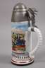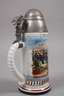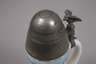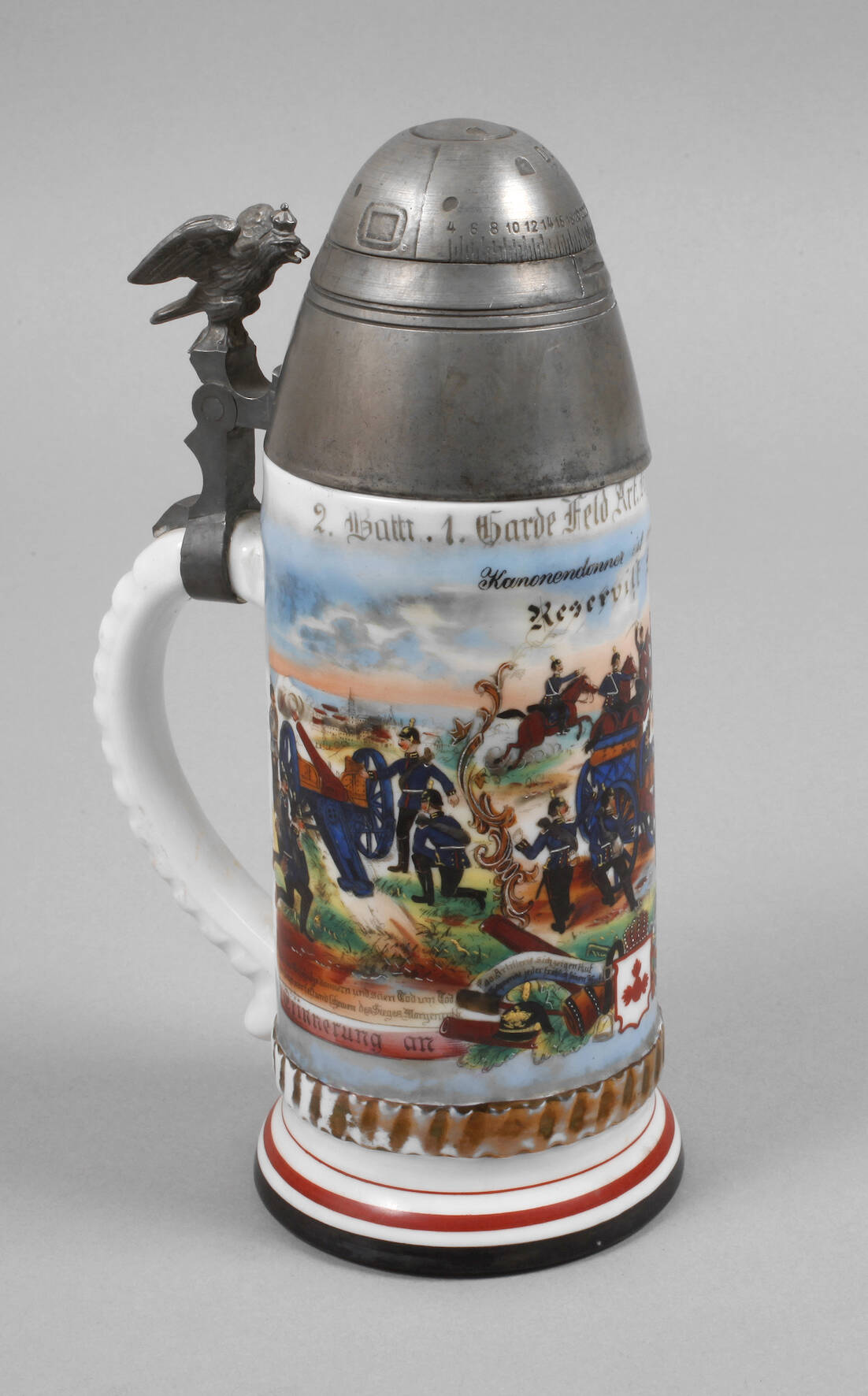 bezeichnet "2. Battr. 1. Garde Feld Art. Rgt. Berlin. 1903–05", Namensangabe Reservist Brunoip, schauseitig Transport einer Feldkanone mit Pferden über Militärutensilien, links und rechts Manöverszenen (Farben leicht verblasst), hinten zwei Namensleisten, Bodenlithophanie Abschiedsszene, am Fuß ehemals vergoldeter Drallring, Zinndeckel in Form eines Geschosskopfs (zerlegbar), als Drücker ein preußischer Adler, Zustand 2–3, H max. 25 cm.