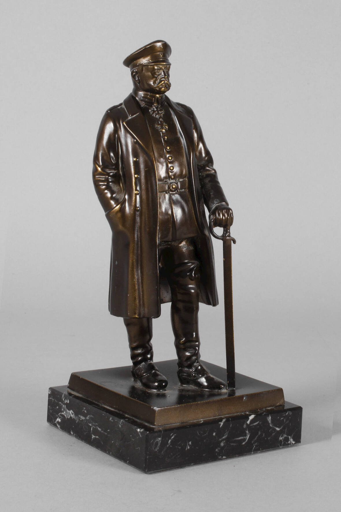 Metall bronziert, Hindenburg in Uniform mit Pour le Mérite und Großkreuz des Eisernen Kreuzes, stehend mit Säbel bei Fuß, auf Marmorsockel, guter Zustand, H 30 cm.