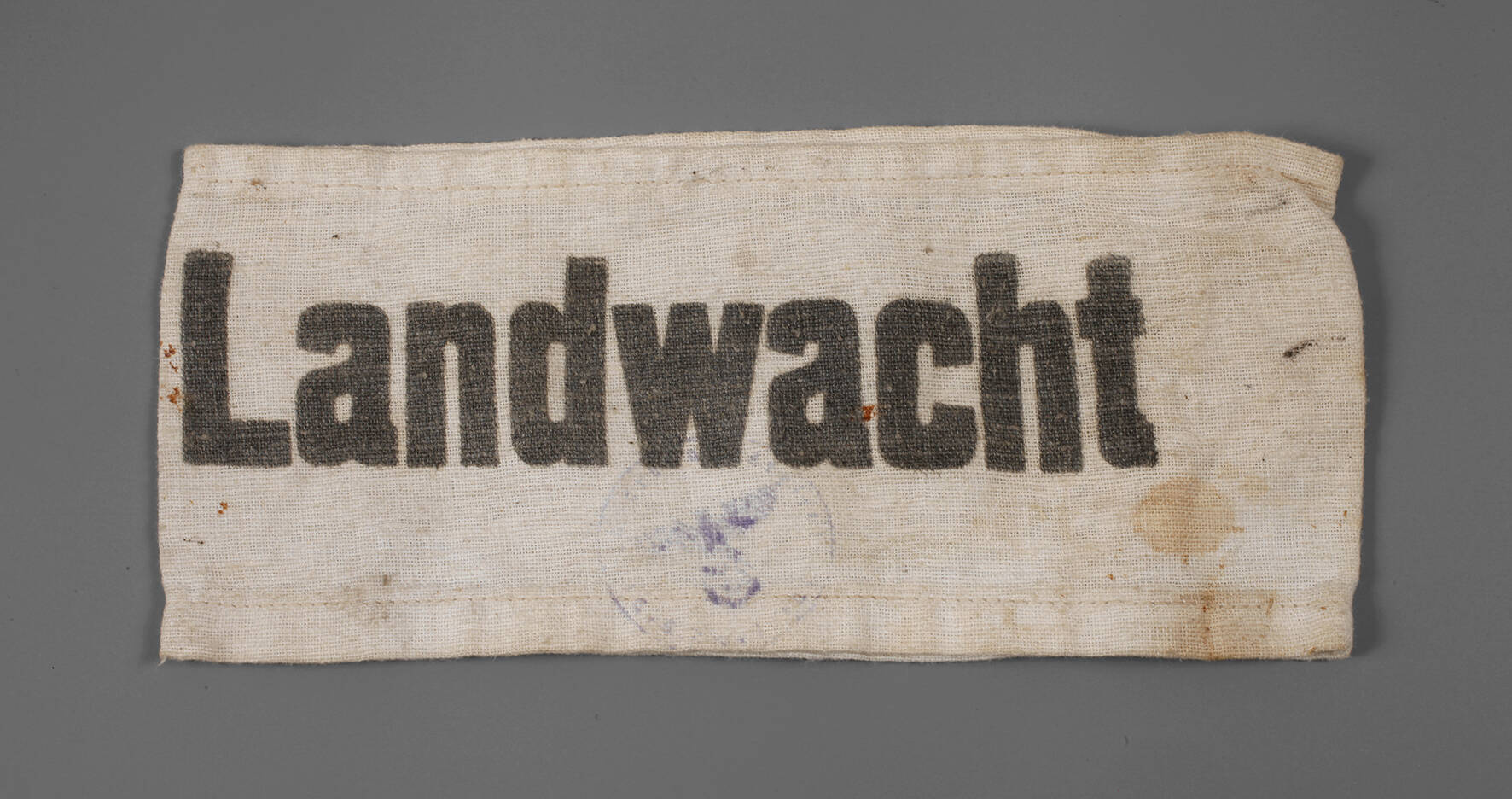 Baumwollstoff mit Aufdruck Landwacht und Siegelstempel, dieser verblasst, H 8 cm, altersgemäßer Zustand.