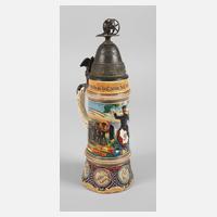 bezeichnet "12. Inf. Rgt. Prinz Arnulf 10. Comp. Neu-Ulm 1902/1904", Namensangabe Infanterist Leonhard Werner, schauseitig 12er Schulterklappe auf Bayerischem Wappen, eingerahmt von militärischen Utensilien über Stadtansicht Ulm, links und rechts Abschieds- und Manöverszenen, hinten zwei Namensleisten, Bodenlithophanie Abschiedsszene (Spinne), Zinndeckel mit Infanteriesoldaten und Bayerischem Löwen, als Drücker ebenfalls Bayerischer Löwe, guter Zustand, H max. 29 cm.