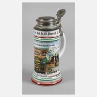 bezeichnet "5. Comp. kgl. Sächs. 10.Inft.-Regt. Nr. 134, Plauen i. V. 1907/1909", Namensangabe Martin Schmiedel, schauseitig die Kaserne Plauen über Sächsischem Wappen, Fahnen und militärischen Utensilien, links und rechts Abschieds- und Manöverszenen, hinten zwei Namensleisten, Bodenlithophanie Abschiedsszene, Zinndeckel mit Stadtansicht Plauen, als Drücker das Sächsische Wappen unter Eichenlaub, gehalten von zwei Löwen, guter Zustand, H max. 23 cm.