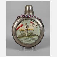 1. Weltkrieg, Glasflasche mit Metallmontierung, Avers Bild eines signalgebenden Matrosen zwischen Deutscher- und Reichskriegsflagge, im Hintergrund zwei Kriegsschiffe, Bild Revers fehlt, eingebunden mit blau-weiß-roter Kordel, Z 2–3, H mit Trinkbecher ca. 15,5 cm.