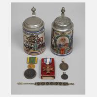 Jubiläumskrug Bayern, bezeichnet "14. Inf. Regiment Hartmann Nürnberg 1814/1914", schauseitig Prinzregent Luitpold unter Krone im Lorbeerkranz, links Soldat in Uniform von 1814, rechts Soldat in Uniform von 1914, in Hintergrund Stadtbilder von Nürnberg, Zinndeckel ebenfalls mit Stadtbild Nürnbergs, als Drücker eine Eichel, Hersteller L. Ostermayr Nürnberg als rote Bodenmarke; Heimkehrerkrug, bezeichnet "Des Kriegers Heimkehr", schauseitig geschmückter Soldat mit Frau und zwei tanzenden Kindern, eingerahmt von Zierleisten mit dem deutschen, türkischen, österreichischen und ungarischen Wappen, Zinndeckel mit Gravur "Den Feind bezwingen, Die Heimat erringen, Habach, Kriegs-Weihnachten 1916", als Drücker Kugelknauf, beide aus Steinzeug, 1/2 Liter, im guten Zustand, H max. 17 cm; Bayerisches Militärverdienstkreuz 3. Klasse mit Schwertern, Z 1, im roten Etui, dieses mit Erhaltungsmängeln; Jubiläumsmedaille 14. Inf. Rgt. Hartmann 1814–1914, Z 2; Vereinigungsmedaille Inf. Rgt. Hartmann vom 1. Februar 1909 am Bandspange, Z 1; silberne Jubiläumsmedaille zum 80. Geburtstag von Kronprinz Luitpold, 12. März. 1901, Z 3; Eisentaler "Gold gab ich zur Wehr, Eisen nahm ich zur Ehr", broschiert, Z 2; sowie ein patriotisches Armband aus Eisernen Kreuzen, Z 2, L 20,5 cm.