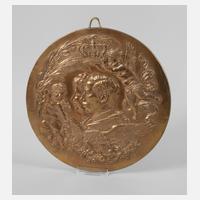 um 1906, Reliefplatte, wohl zur Silberhochzeit des Kaiserpaars, mittig Kaiser Wilhelm II. mit Kaiserin Auguste Viktoria, links ein Engel, der einen Lorbeerzweig, rechts oben ein Engel, der die Kaiserkrone über das Paar hält, unten der Preußische Adler mit einer Schlange in den Fängen, Bronze poliert, guter Zustand, D 28 cm.