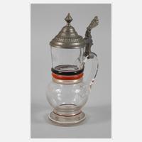 um 1920, bezeichnet "Heil, wir Deutschen fürchten Gott und sonst nichts auf der Welt", bauchiger Krug mit drei Ringen in den Farben schwarz–rot–gold, verzierter Zinndeckel mit Gravur "20 Hans Blaschke 17", flacher Drücker mit Edelweiß darauf, am oberen Griffende ca. 8 cm langer Sprung im Glas, Z 2, H max. 24 cm.