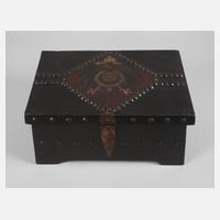 um 1880, Holzschatulle mit aufgelegtem Reichsadler unter Krone aus geprägtem Leder, die Ränder sowie die Seiten der Schatulle mit Ziernieten beschlagen, Schlossbügel aus Metall mit altem Vorhängeschloss von "Phönix", innen mit Schmuckpapier bezogen, guter Zustand, Maße 17 x 34 x 23 cm.