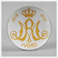 anlässlich des 80. Geburtstag der Prinzessin von Sachsen-Altenburg (letzte Königin von Hannover) am 14. April 1898, unterglasurblaue Knaufschwertermarke 1860–1924, 1. Wahl, Ritznummer, Coupe-Form, Chiffre MR mit Königskrone und Jubiläumszahlen 1818–1898 in gelber Unterglasurbemalung sowie grüne Randlinie, Wandaufhängung, guter altersgemäßer Zustand, D 22,5 cm.