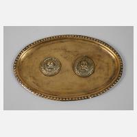 um 1920, Messingtablett mit zwei Koppelschlossmedaillons des Freikorps Werwolf, 1. und 2. Modell, Messing geprägt, mit Totenkopf unter "Wehr Heil", über "W", Eichenlaub und Lorbeerschleife, guter Zustand, D Medaillons 42 mm, Maße Tablett 15 x 23 cm.