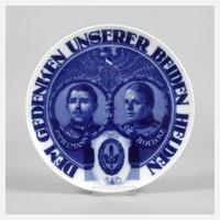 bezeichnet "Dem Gedenken unserer beiden Helden", grüne Stempelmarke mit Zusatz Kunst-Abteilung Selb-Bavaria und Kriegsmarke 1914–1917, Coupe-Form, kobaltblauer Unterglasurdekor aus Doppelportait der gefallenen Jagdflieger Max Immelmann und Oswald Boelcke, Reichsadler, Vereinsemblem und Umschrift, Wandaufhängung, eine kleine herstellungsbedingte Glasurfehlstelle, sonst guter Zustand, D 24 cm.