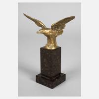 um 1930, kleiner Metalladler, patiniert, auf Serpentinsockel, mit Herstelleretikett – Wolfgang Schwarz, Figuren, Plaketten, Abzeichen, Berlin n. 65, Müllerstrasse 175, guter Zustand, H ges. 20 cm.