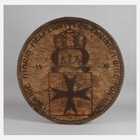 Ende 1. Weltkrieg, Holzscheibe mit Ziernägeln beschlagen, in der unteren Hälfte ein Malteserkreuz mit der Jahreszahl 1918 zwischen den Kreuzarmen, darüber ein M unter Kaiserkrone, mit Umschrift "Heilige Maria Helferin der Christen bitte für uns", Aufhängevorrichtung auf der Rückseite, starke Altersspuren, D ca. 90 cm.